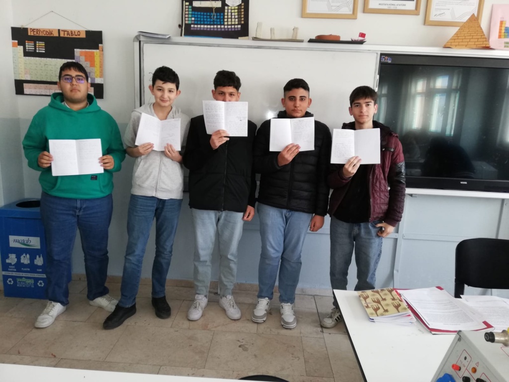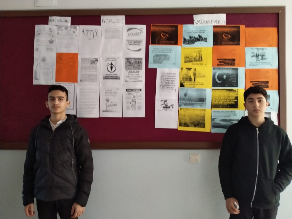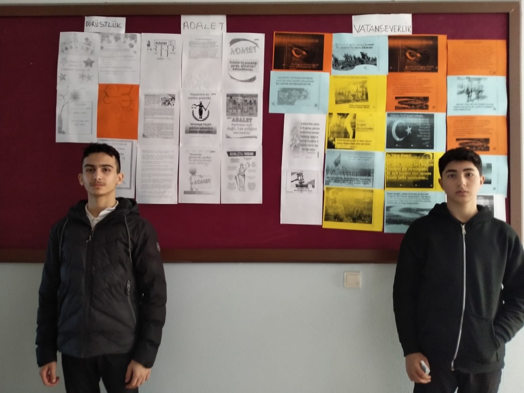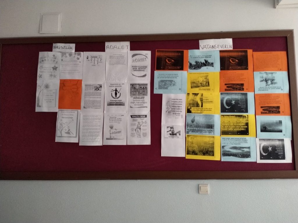Değerler Kulübü'nün çalışmalarında Mart Ayı değerlerimiz, adalet ve vatanseverlik oldu. Bu degerlerimizle ilgili değer defterlerimizi tuttuk, panomuzu hazırladık, ayın en saygılı ve sorumluluk sahibi öğrencilerini seçtik, değerlerimizle ilgili kısa filmler izlettik.