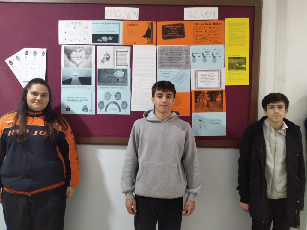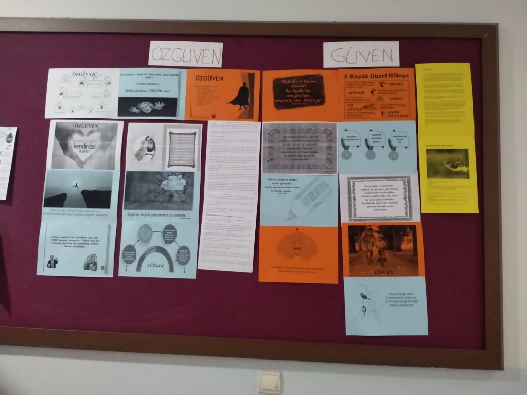Ocak-Şubat ayları değerlerimiz olan güven ve özgüven ile ilgili değerler deftrimizi tuttuk, okul panosu hazırladık, kısa filmimizi izlettik, ayın öğrencisini seçtik, velilerimize broşür ve veli mektubu gönderdik...